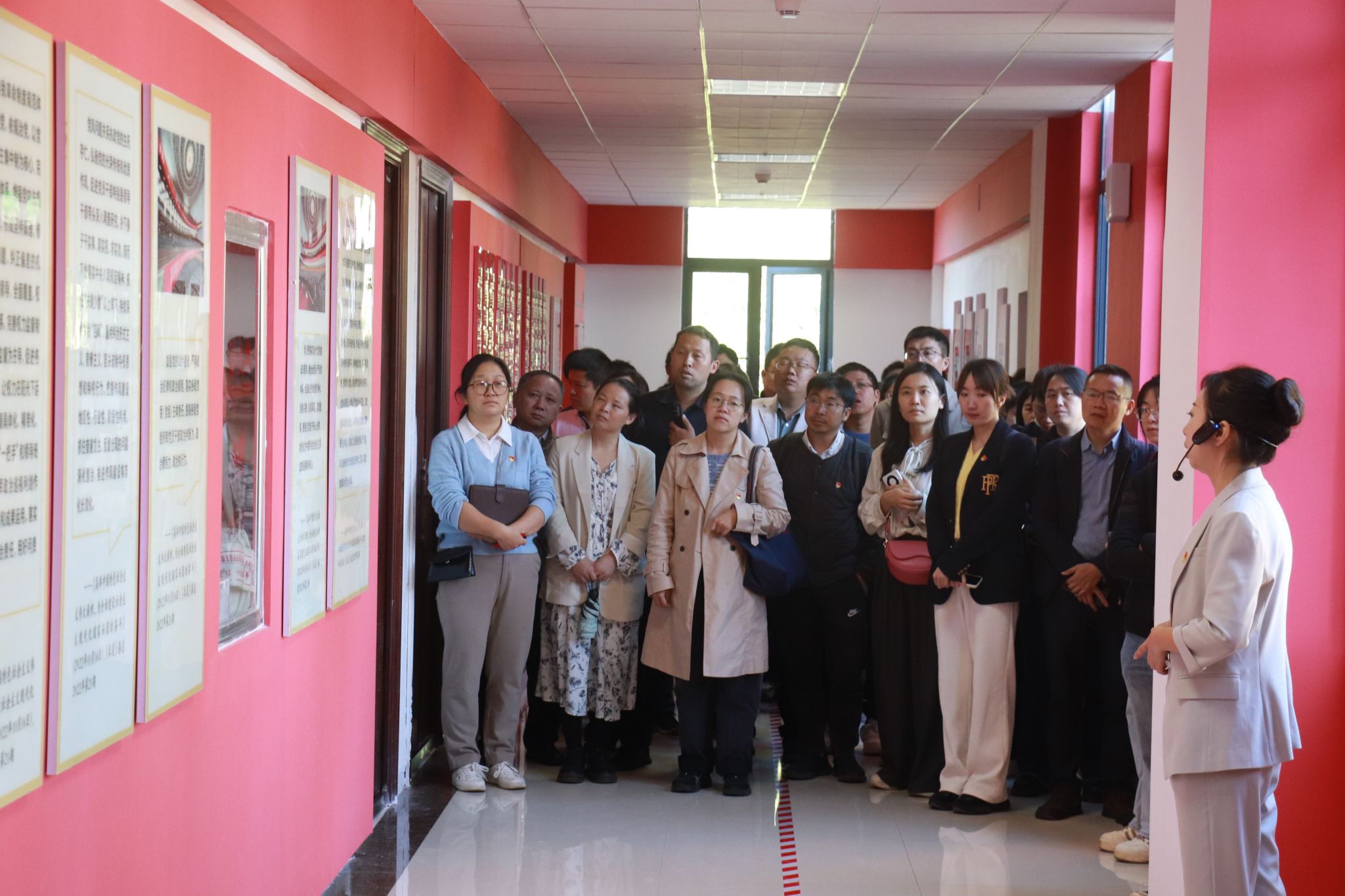 参访者通过认真聆听讲解,沉浸式体验了“途经红墙抬头望、漫步长廊静思量、潜移默化铸信仰、润物无声见成长”的党建育人创新模式。太阳成集团tyc234cc党委“红墙育人长廊”以“为党育人、为国育才”为主题,以党建引领公司育人工作发展为主线,因地制宜将公司教学楼一楼至三楼的走廊建造为以红色墙面为主色调的党建育人长廊。在内容设计上,“红墙育人长廊”由党的光辉历程、伟大精神谱系、伟大工程建设、党建引领发展、先锋模范典型、严守纪律规矩、公司党建育人特色实践等七个篇章组成,集中展示了党的建设取得的伟大历史成就、形成的伟大精神力量、涌现的先进模范、守护的良好政治生态,以及公司党建促进事业高质量发展方面取得的突出成效。特别是突出展示了公司党委认真贯彻落实党的教育方针,全面落实立德树人根本任务,努力培养德智体美劳全面发展的社会主义建设者和接班人的生动实践。