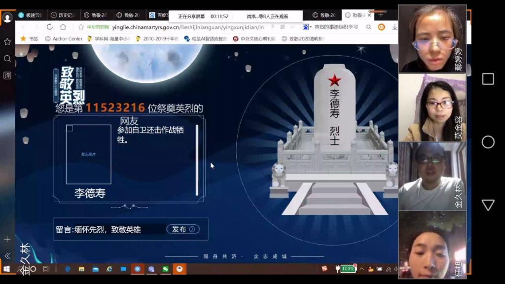 学习完英烈事迹后,各支部党员进入中华英烈网,在网上纪念堂为英烈敬献鲜花、留言寄语等,并对学习的英烈事迹发表感想。“疫情来势汹汹,措不及防,正是他们用生命和疫情作斗争保卫着我们,保卫着国家”;“为国家和人民鞠躬尽瘁,他们的死重于泰山,他们无私奉献无畏牺牲的精神值得我们学习,更激励着我们要成为新时代的优秀党员”;“生命的意义在于对信念的坚持,在于对信仰的追求,生命的价值则在于为信念、信仰奋斗过程中的奉献。因而,作为一名党员,要时刻怀着感恩之心,铭记先烈,奋发向上。”这些言语之中满怀着对革命英烈的崇敬之意、感念之情、传承之志。随后在各支部书记的组织下全体党员起立默哀3分钟,缅怀先烈,寄托哀思。活动最后,由各支部书记带领支部党员重温入党誓词,不断鞭策、激励自己,时刻牢记共产党员的初心与使命,用实际行动为祖国的发展贡献力量。