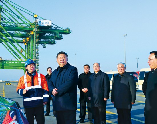 2019年1月16日至18日,中共中央总书记、国家主席、中央军委主席习近平在京津冀考察,主持召开京津冀协同发展座谈会并发表重要讲话。这是1月17日下午,习近平在天津港码头考察。 新华社记者 鞠鹏/摄