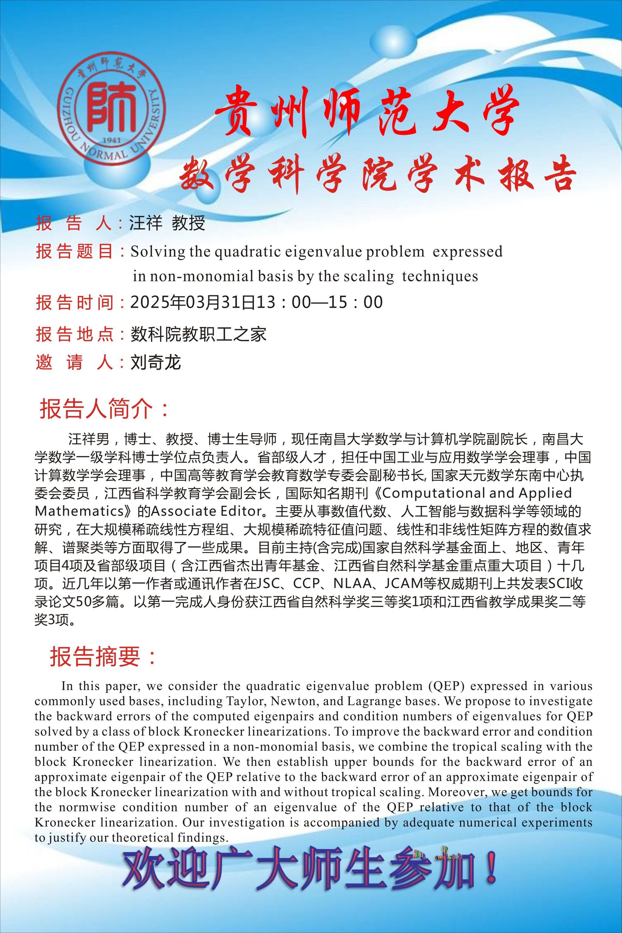 南昌大学汪祥教授受邀为公司师生做学术报告