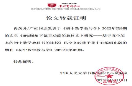 近日,公司数学与跨文化数学教育研究所严虹教授指导的硕士研究生冉茂分研究成果《HPM视角下德育功能的教材文本研究——基于五个版本的初中数学教科书的比较》被人大复印资料《初中数学教与学》2023年第02期全文转载。