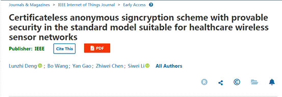 公司邓伦治教授团队在信息科学领域Top期刊IEEE Internet of Things Journal (2022年最新IF=10.238)在线发表题目为“Certificateless anonymous signcryption scheme with provable security in the standard model suitable for healthcare wireless sensor networks的研究论文。该研究构造了一个适用于医疗无线传感器网络的无证书匿名签密方案。
