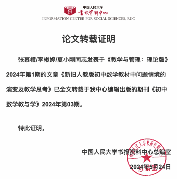 近日,公司夏小刚教授指导的2021级硕士生张慕橙在《教学与管理(理论版)》2024年第1期发表了题为“新旧人教版初中数学教材中问题情境的演变及教学思考”的研究论文。《教学与管理》系全国中文核心期刊、中国人文社会科学综合评价AMI扩展期刊、人大复印资料重要转载来源期刊。该研究成果同时被人大复印报刊资料《初中数学教与学》2024年第03期全文转载。