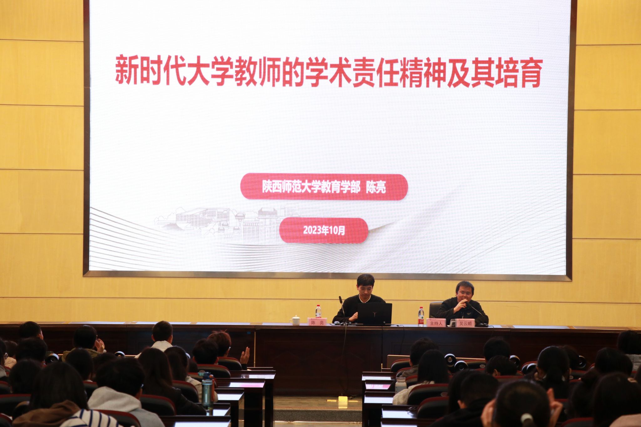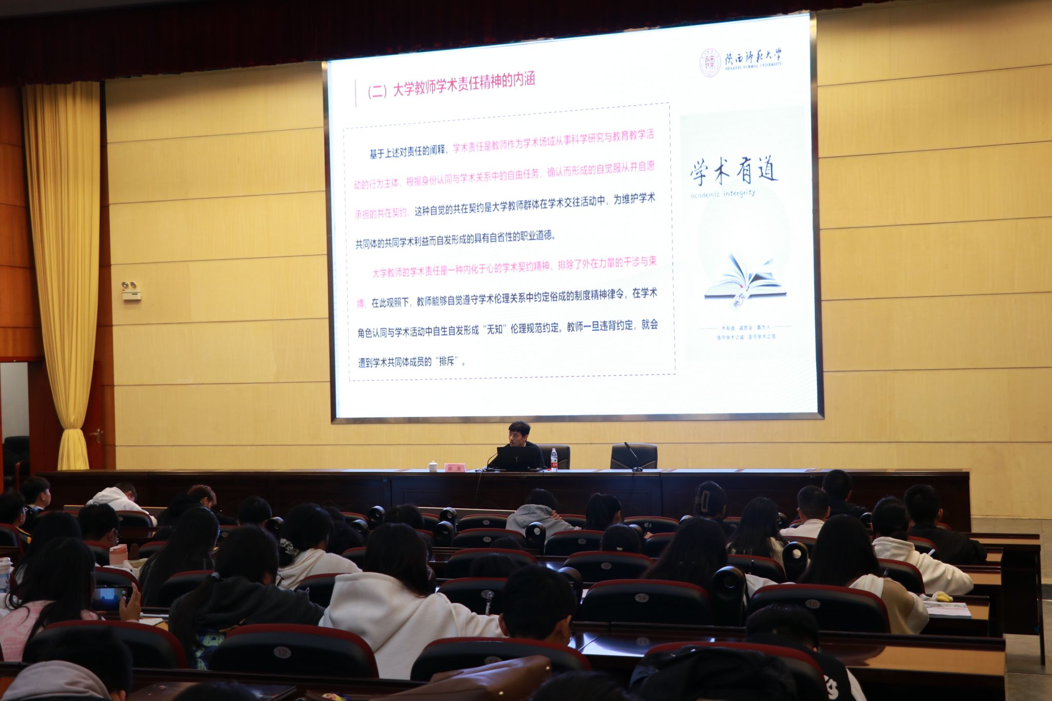 为加强员工对教师学术责任的理解,让员工深刻明白教师是立教之本、兴教之源的道理,10月27日,陕西师范大学陈亮教授于太阳成集团tyc234cc花溪校区会议中心一楼学术报告厅开展“新时代教师的学术责任精神及其培育”主题讲座。2021级和2022级数学与应用数学专业全体同学参加此次活动。