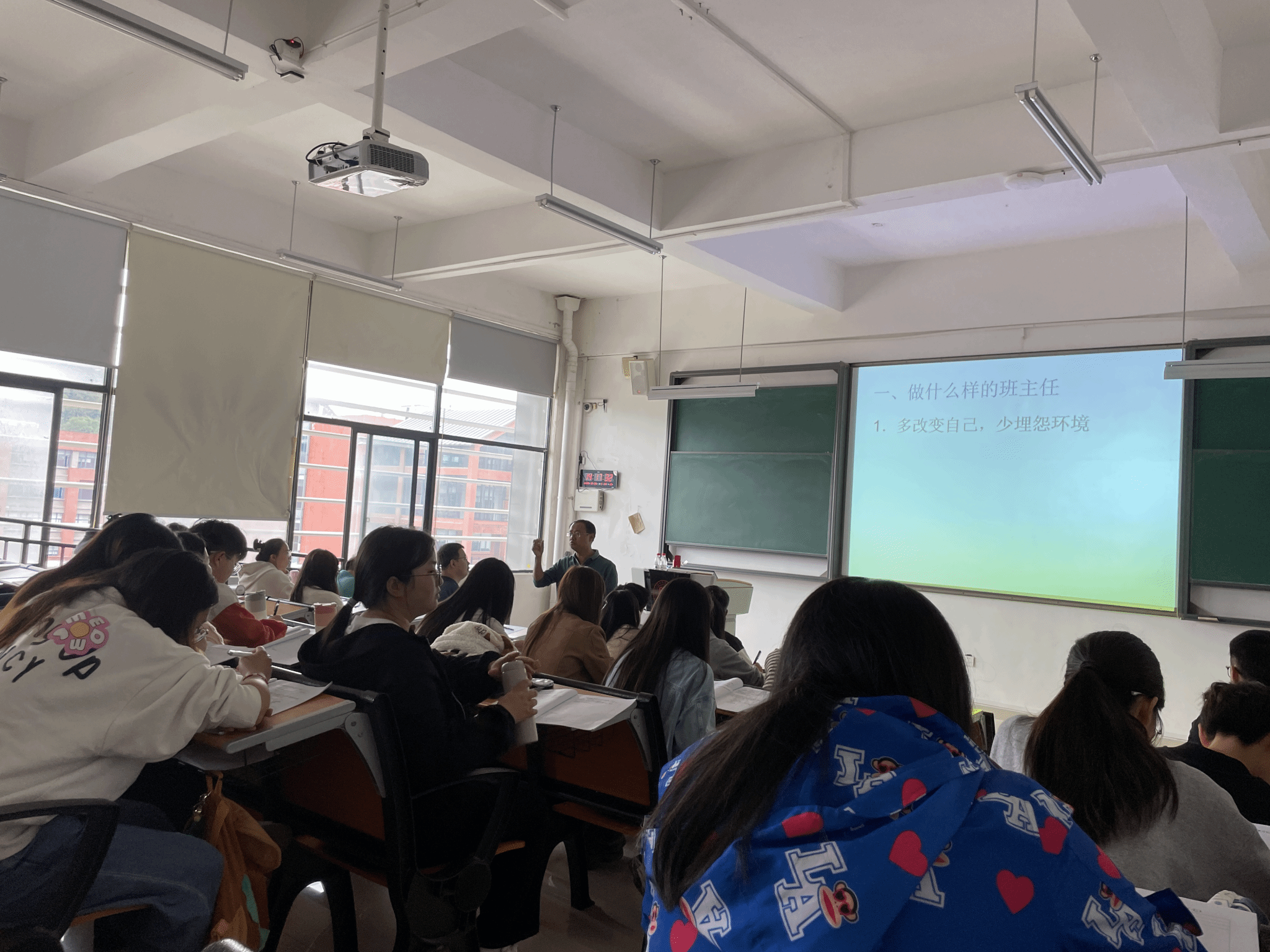 刘刚老师从怎样建立班级组织、如何组建班级团队、与家长和员工的沟通技巧、如何成为一位有魅力的老师等四个方面,分四次课逐项与全体同学分享、交流其开展班级管理的经验。
