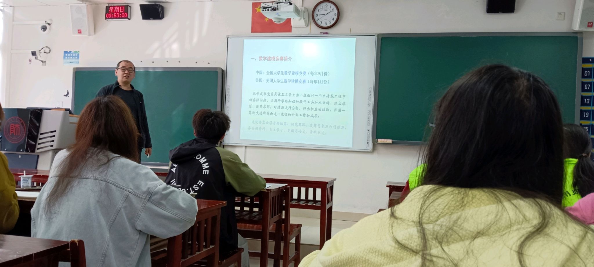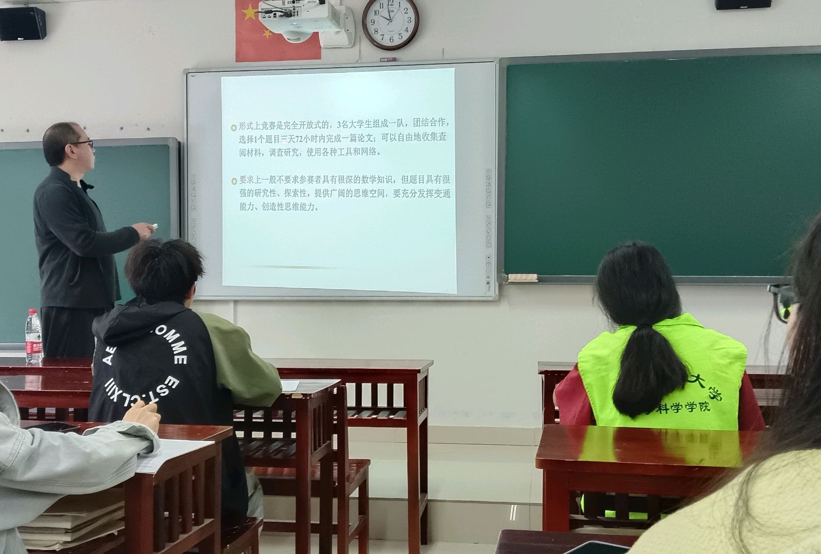 为帮助员工充分了解老员工数学建模竞赛并学习相关知识,激发员工对数学建模竞赛的兴趣,2024年4月26日,太阳成集团tyc234cc张德金老师于太阳成集团tyc234cc花溪东校区太阳成集团tyc234ccS204教室开展了“数学建模竞赛简介”主题讲座,2023级信息与计算科学与应用统计学专业全体员工参加此次讲座。