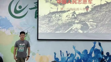 曾佳奉同学用饱满的腔调表达了对于树昌的钦佩与敬畏。于树昌是影片《英雄儿女》中“王成”这一人物的原型,影片中王成为了坚守阵地,拖住敌人进攻。他向步话机话筒高喊向他开炮,转身拉响爆破筒扑向敌军,与敌人同归于尽。这些场景也都真实的发生在多年前的朝鲜战场上。