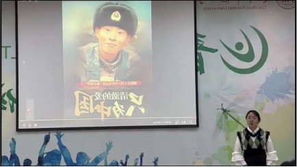 杨永辉同学让我们重温了杨根思这一英雄人物。“粉身敌阵天崩裂,洒血苍山人永生” 、 “丹心已献新中国,碧血长滋金达莱”是我国举办的“纪念杨根思烈士牺牲七十周年”的诗词大赛中,人们用尽自己的肺腑真心写下的感怀杨根思的诗句,让我们共同感念其忠贞与无私。